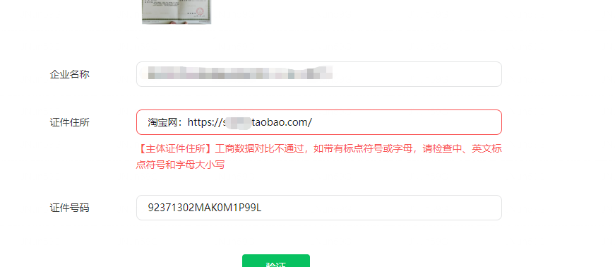 营业执照的地址是一个网址,备案提交资料的时候一直提示工商数据比对不通过
