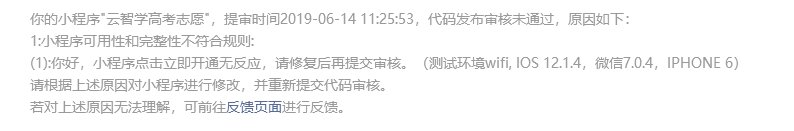 你好,经核实,贵方小程序最新提审版本服务内容中涉及虚拟产品购买,ios平台规则不支持,任何为用户提供前往支付流程的路径/文案都将被拒绝,包含但不限于虚拟产品的购买指引流程,价格展示,已购产品展示,付费及购买的展示按钮、文案及图片,引导用户到微信公众号、H5、APP或是任何外链进行付费等,请整改后再重新提交审核。(详图如下)