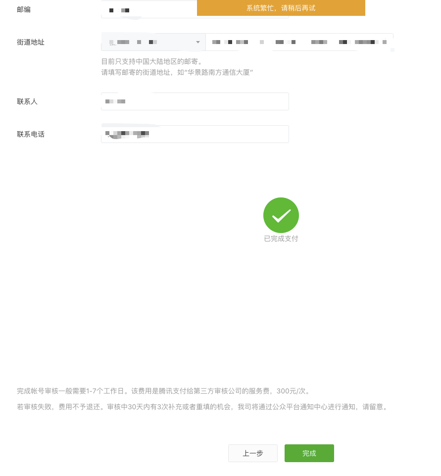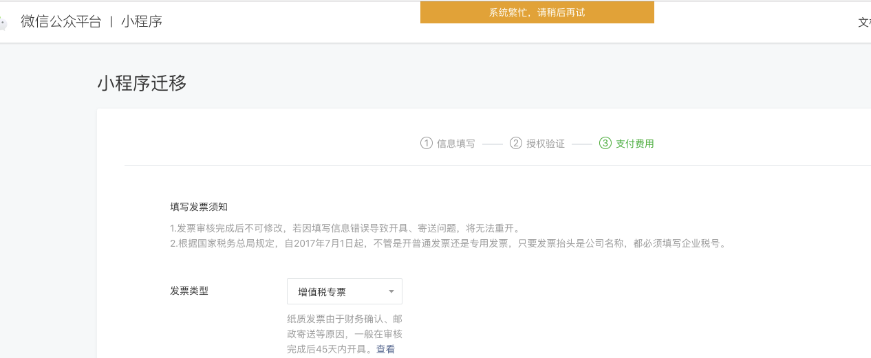 小程序迁移最后一步,费用已经支付,最后一步点击完成,显示系统繁忙,请稍后再试,无法提交认证?