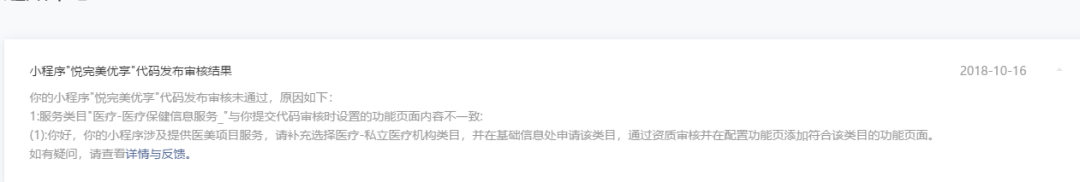 你好,经核实,贵方小程序最新提审版本涉及提供医美项目服务,如自体脂肪面部填充、光子嫩肤等,需补充选择医疗-私立医疗机构类目