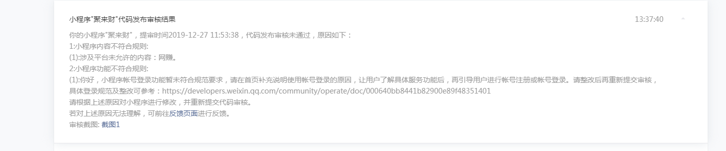 你好,经核实,你的小程序:1.帐号登录功能暂未符合规范要求,请在首页补充说明使用帐号登录的原因,让用户了解具体服务功能后,再引导用户进行帐号注册或帐号登录。请整改后再重新提交审核,具体登录规范及整改可参考:https://developers.weixin.qq.com/community/operate/doc/000640bb8441b82900e89f48351401;2.涉及平台未允许的内容:网赚(详图如下)