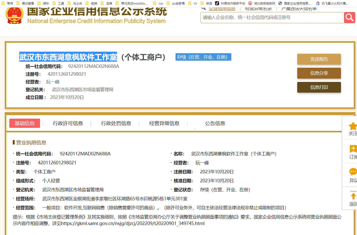 个体工商户已经录入了系统: 武汉市东西湖意枫软件工作室