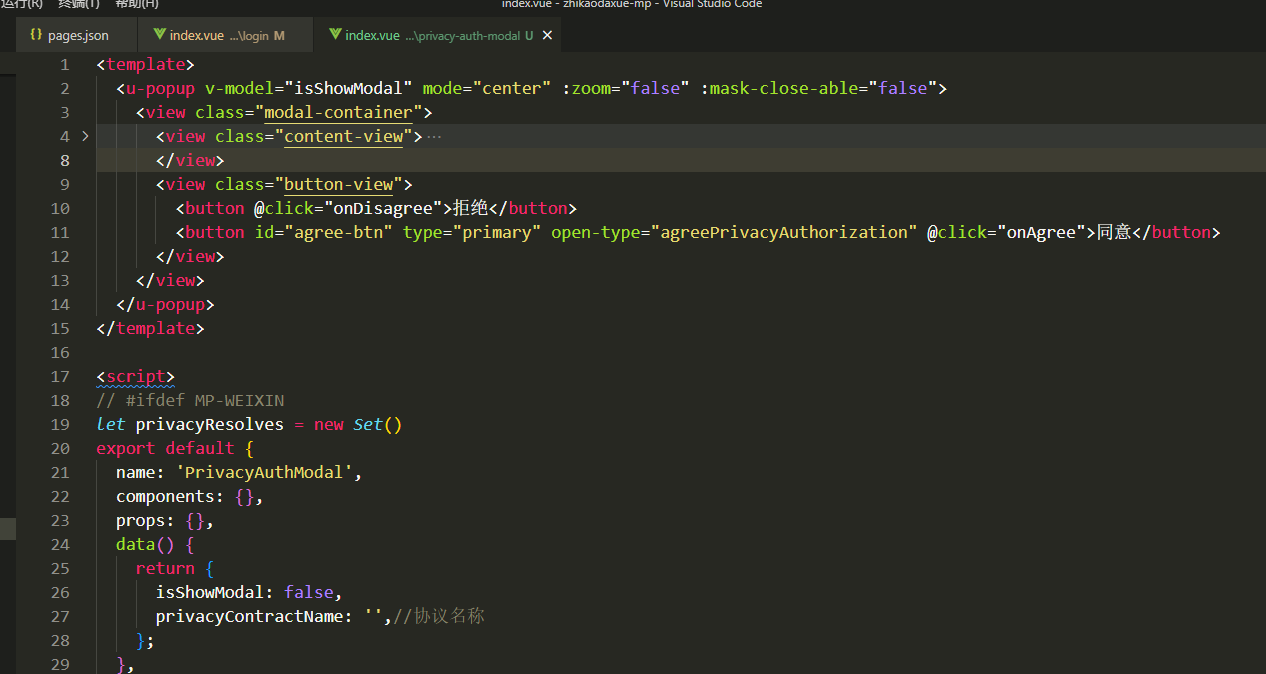 bindagreeprivacyauthorization="onAgree"同意按钮事件写错了,不能用@click,应该使用@agreeprivacyauthorization