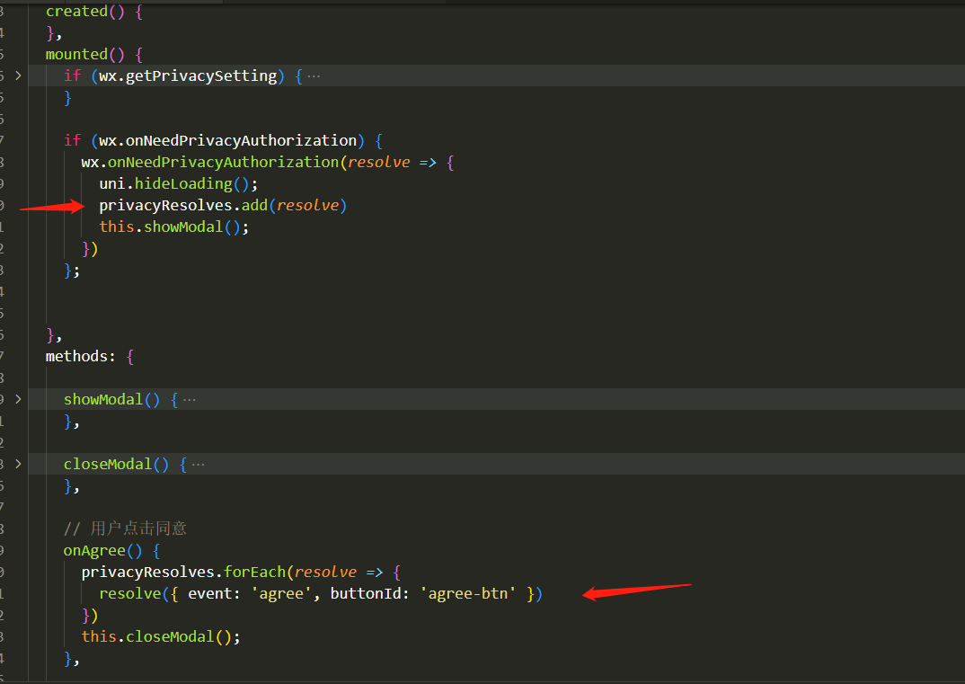 同意按钮事件写错了,不能用@click,应该使用@agreeprivacyauthorization