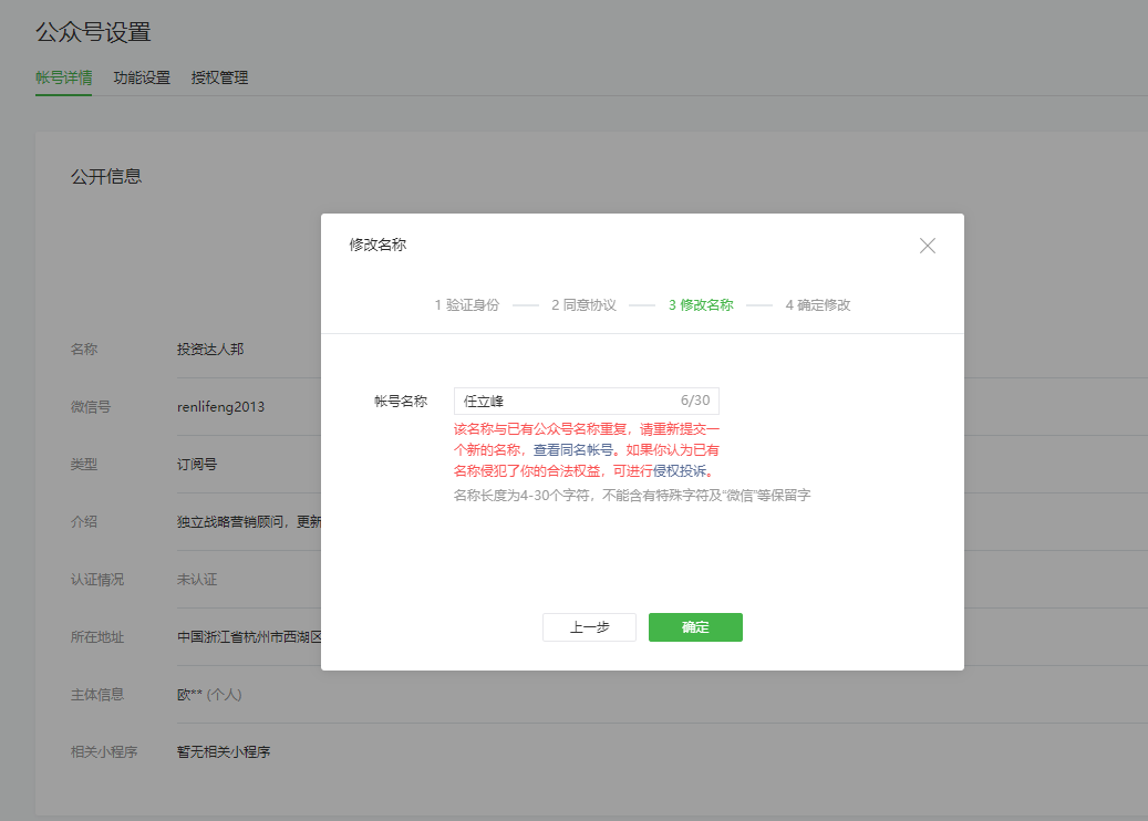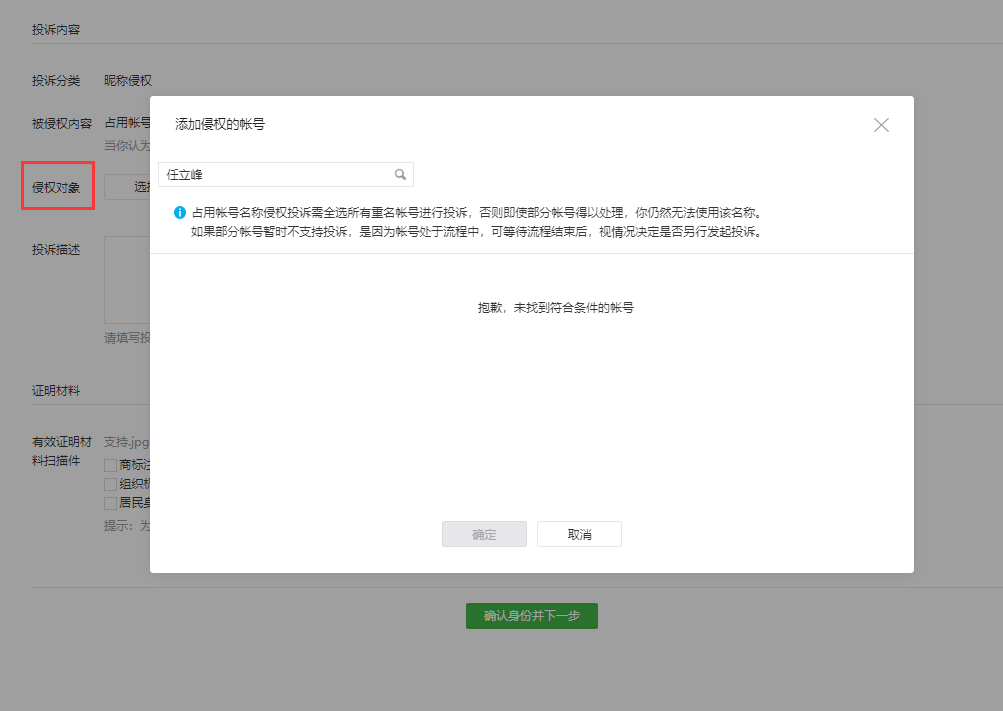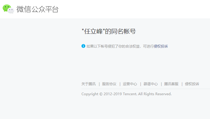 该名称与已有公众号名称重复,请重新提交一个新的名称,查看同名帐号,结果为空,进行侵权投诉,也搜索不到同名账号
