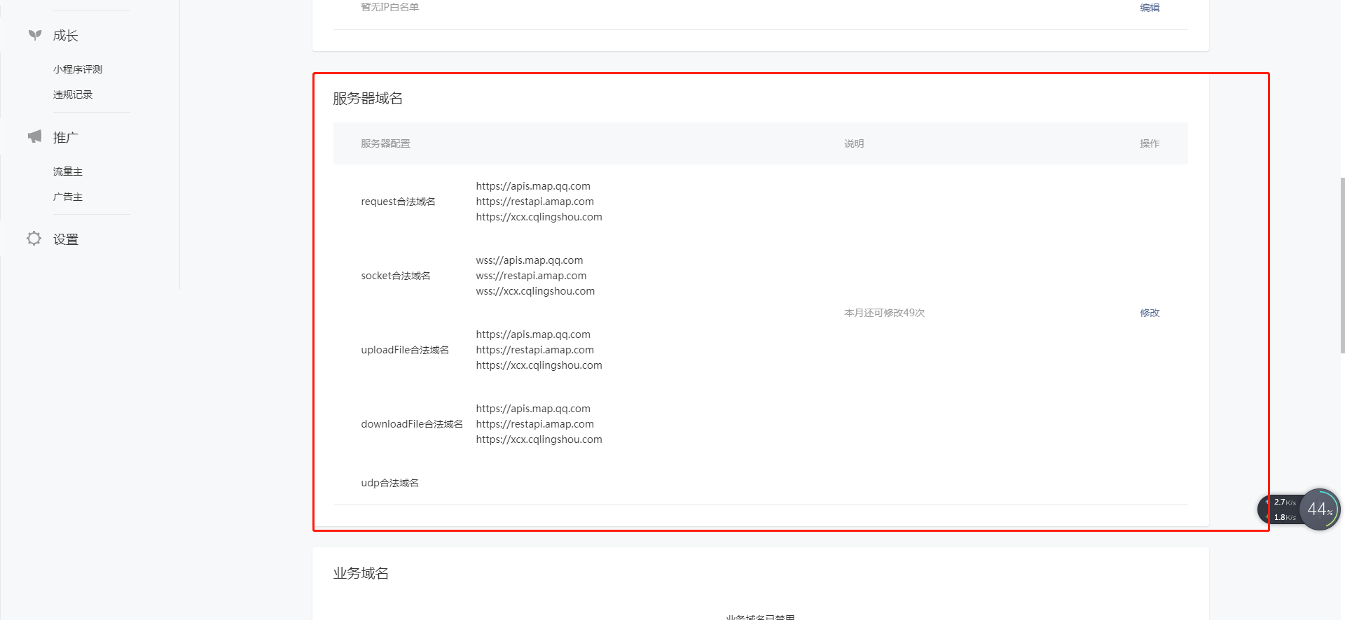 微信公众平台小程序后台开发设置里 服务器域名 一直没有更新