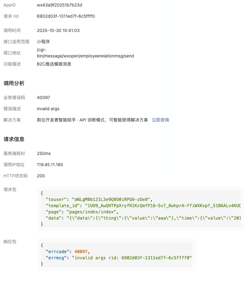 调用接口发送报 “invalid args”,rid: 6902d03f-1311ed7f-6c5ffff0