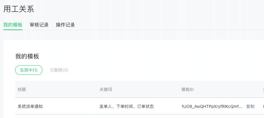 已经添加了用工关系消息模板并审核通过了,如图: