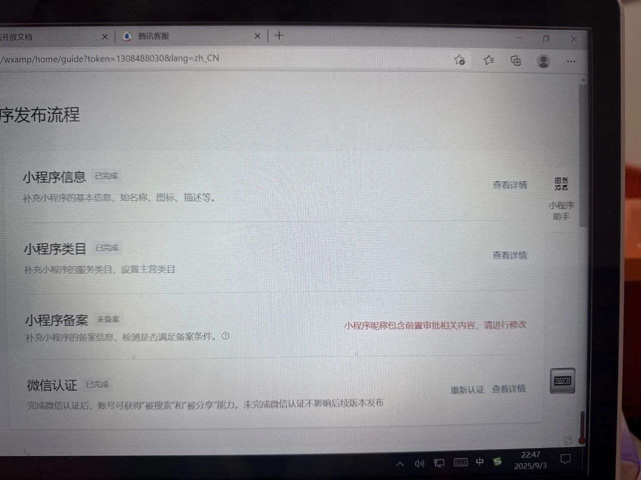 小程序无法备案怎么办,昵称已经修改过,通过审核了,还是无法备案