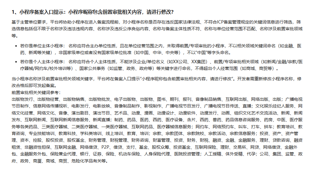 你好,关于小程序备案入口提示:小程序昵称包含前置审批相关内容,建议参考以下进行修改:https://developers.weixin.qq.com/miniprogram/product/record/record_faq.html#%E4%B9%9D%E3%80%81%E5%B0%8F%E7%A8%8B%E5%BA%8F%E6%98%B5%E7%A7%B0%E7%9B%B8%E5%85%B3