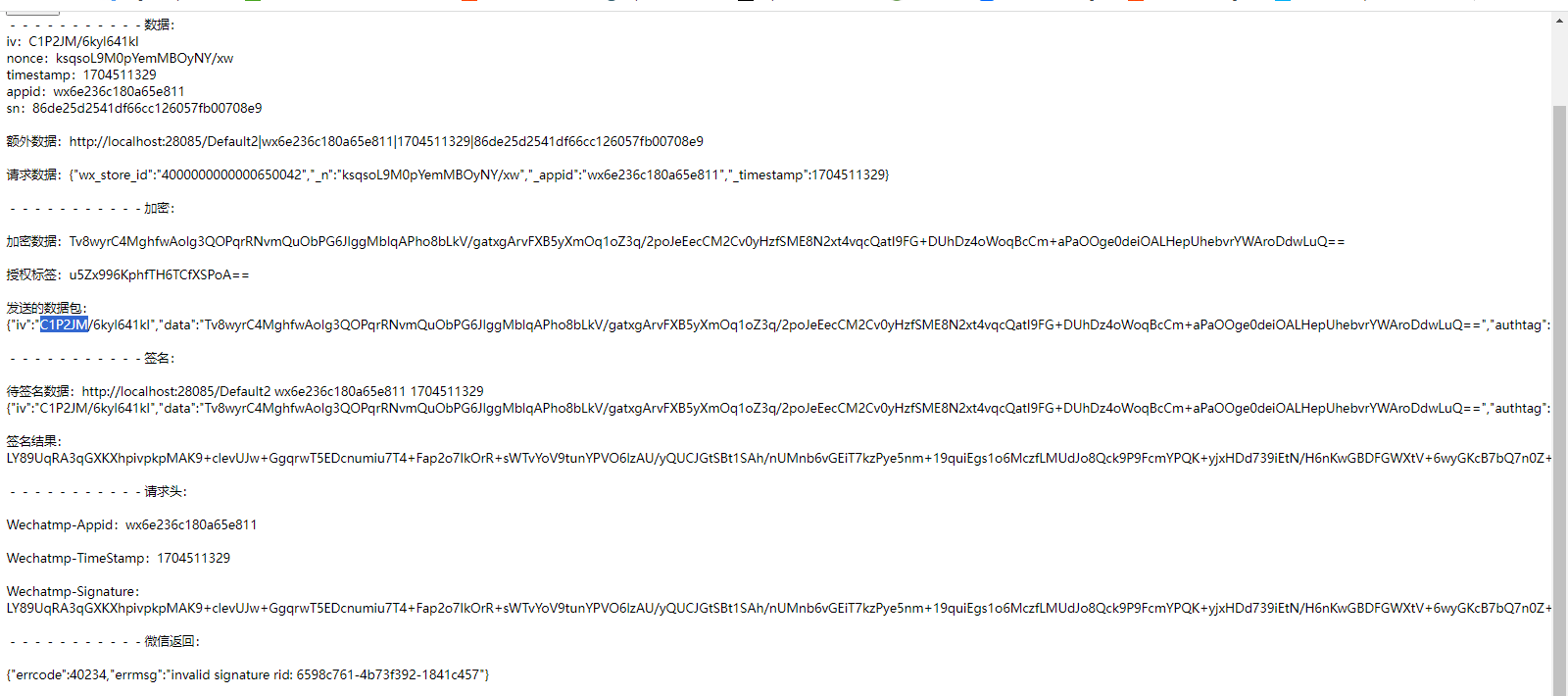 var sss = HttpSignData("encryption", Newtonsoft.Json.JsonConvert.SerializeObject(new { plaintext = plaintext, key = WxConfig.aes_key, iv = config.iv, aad = aad }));