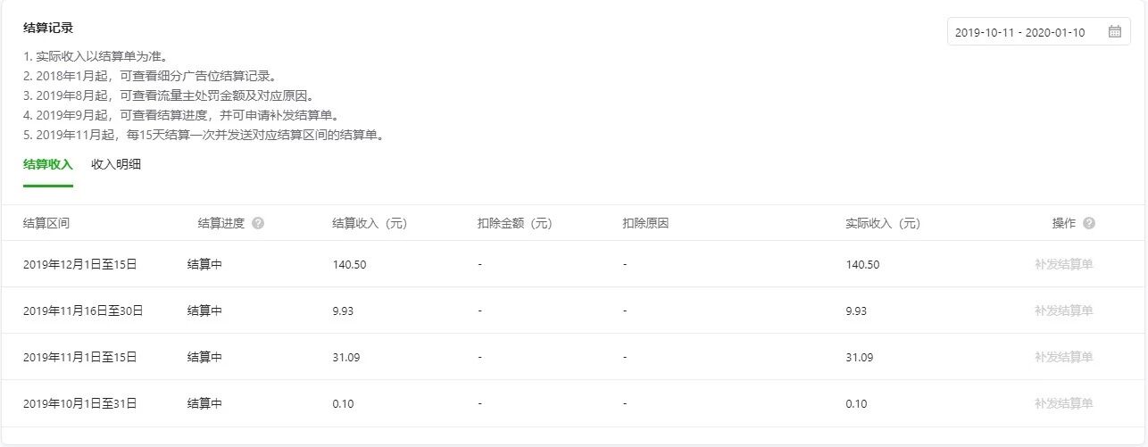 你好,核实该帐号没有及时补充财务,帐号是在2019.12月下旬才补充的财务资料,2019.12月下半月开始才会有结算单(还未下发,建议后续留意下结算邮件),若前期有产生收益,后续我司会统一处理补结的。补结与正常结算的流程是不一样的,补结流程涉及的程序较多,时间较长,补结成功后会下发结算单至对应的结算邮箱的,还请耐心等待后续留意。