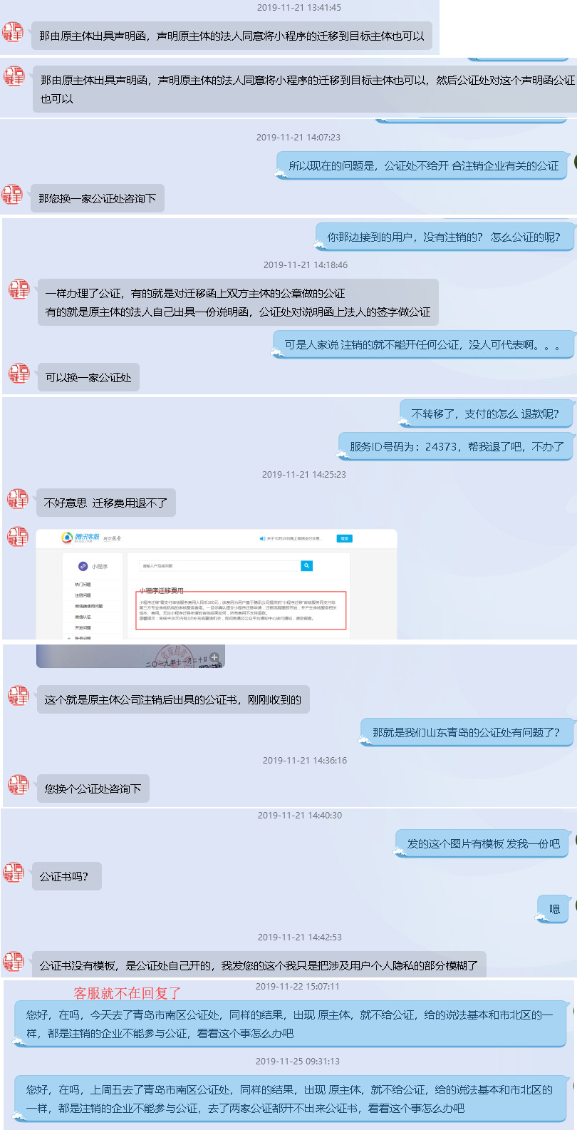 下面是详细过程,客服都用“也可以”字样,并多次让换一个公证处咨询,并给出其他地区开具出来的证明,大概意思是人家能开出来,你怎么就开不出来!!!