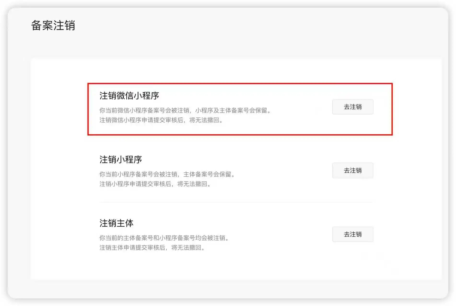 当小程序备案信息与小程序信息不一致时,小程序负责人未及时对小程序备案变更或注销,平台将采用警告、封禁小程序功能、强制注销小程序备案对小程序进一步处置,请及时在【小程序管理后台-设置-小程序备案-变更】发起变更备案。