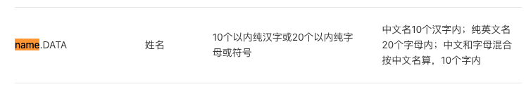 name 字段限制 10个以内纯汉字或20个以内纯字母或符号,不支持数字。