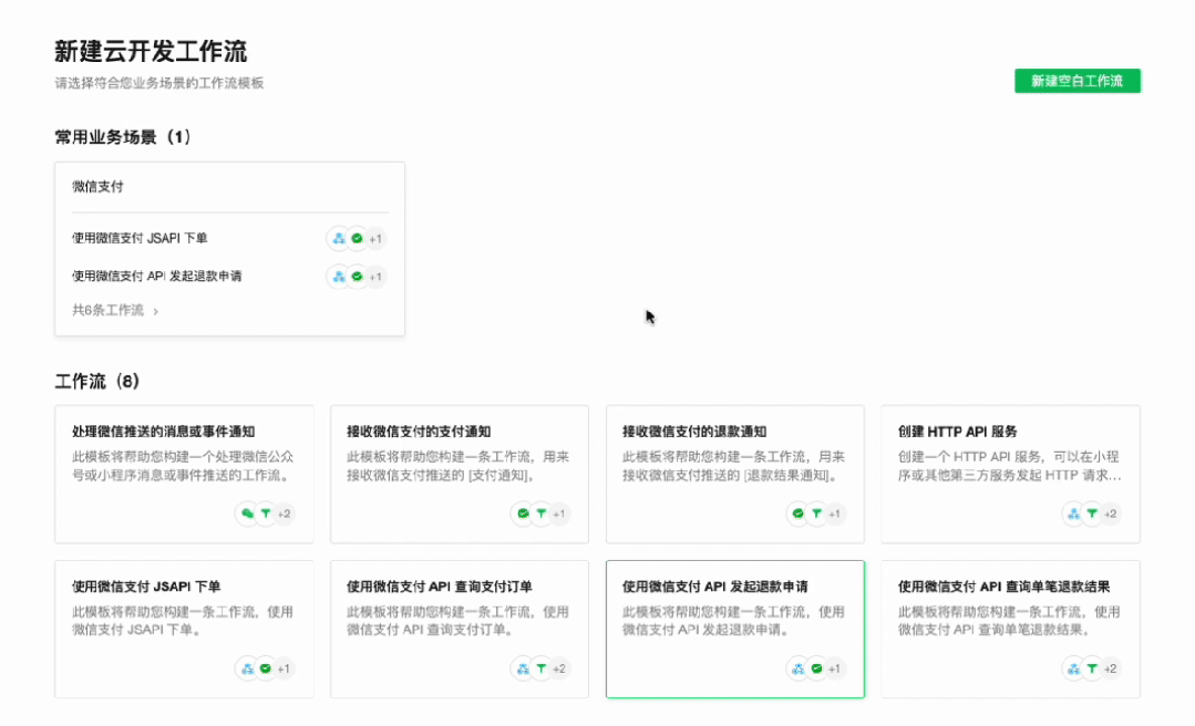 工作流能力能够应用在定时执行云开发、处理微信公众平台事件、对接企业微信等常见场景。
