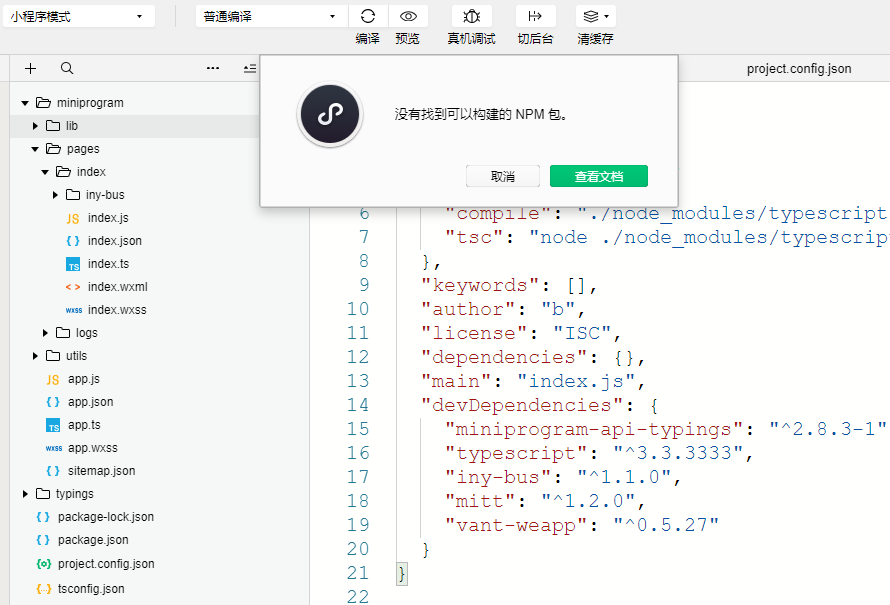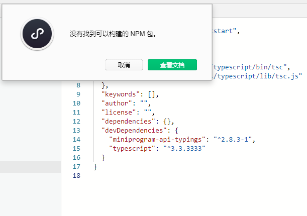 然后尝试将 typescript 和 miniprogram-api-typings 变更为 devDependencies 依赖,构建NPM 后又报 “没有找到可以构建的NPM包