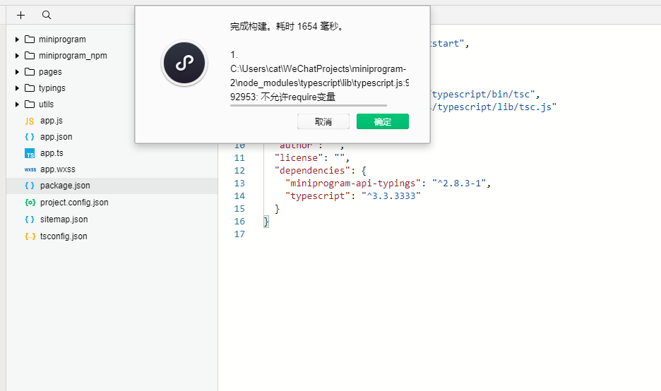 首先是创建好TS模板后,使用 构建npm 报 “没有找到可以构建的NPM包”,然后在社区中找相关的帖子,并根据帖子进行修改(https://developers.weixin.qq.com/community/develop/article/doc/00040e8fd645a033d0f8502bf5b813 根据此贴进行的修改),然后点击 构建NPM,报错 “不能允许使用require变量” (具体报错信息看下图)