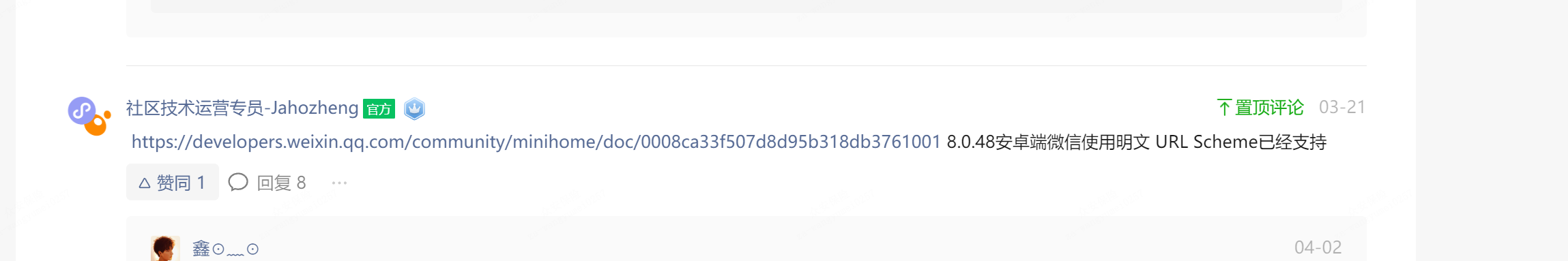 在微信外,因为安卓URLSchema的识别问题,可用H5包一层,即可以设置一个H5页面,点击事件后,使用形如这样的window.location.href='weixin://dl/business/?appid=xxxxx&path=xxx&query=xxxx'方式打开。