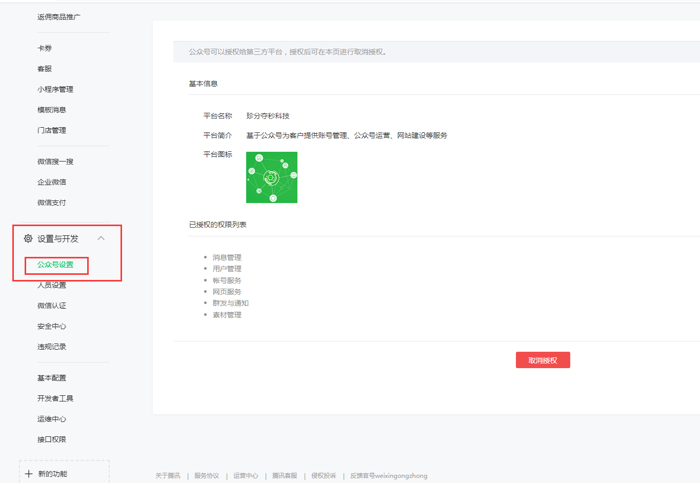 最近一个多月一直收到通知信息“你的公众号接口出现异常,功能可能已经失效,请加入微信群接收接口报警”,已加群,但问题并没有解决,太多技术含量很高的操作用词根本看不懂,了解到是授权给的第三方科技公司好像倒闭了,我公司原来添加此授权的工作人员早已离职,后台查到的授权内容看似清晰,实际模凌两可。怎么能更方便的知道如果取消这个第三方授权是否影响公众号的功能呢?微信平台技术人员能不能直接给些建议。跪求。