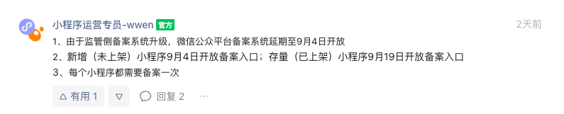 新增 (未上架)小程序9月4日开放备案入口;存量(已上架)小程序9月19日开放备案入口