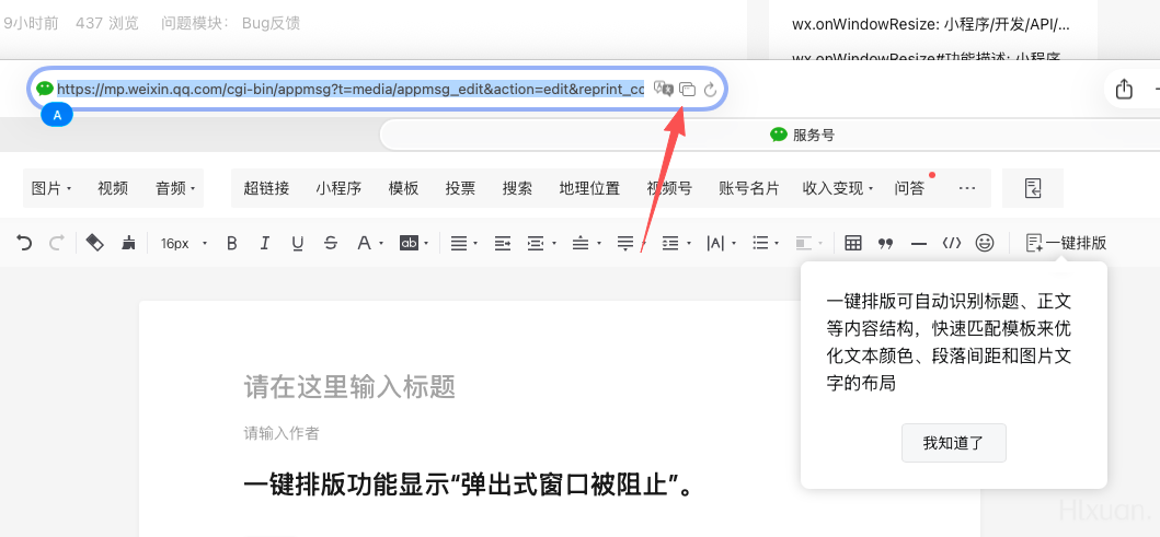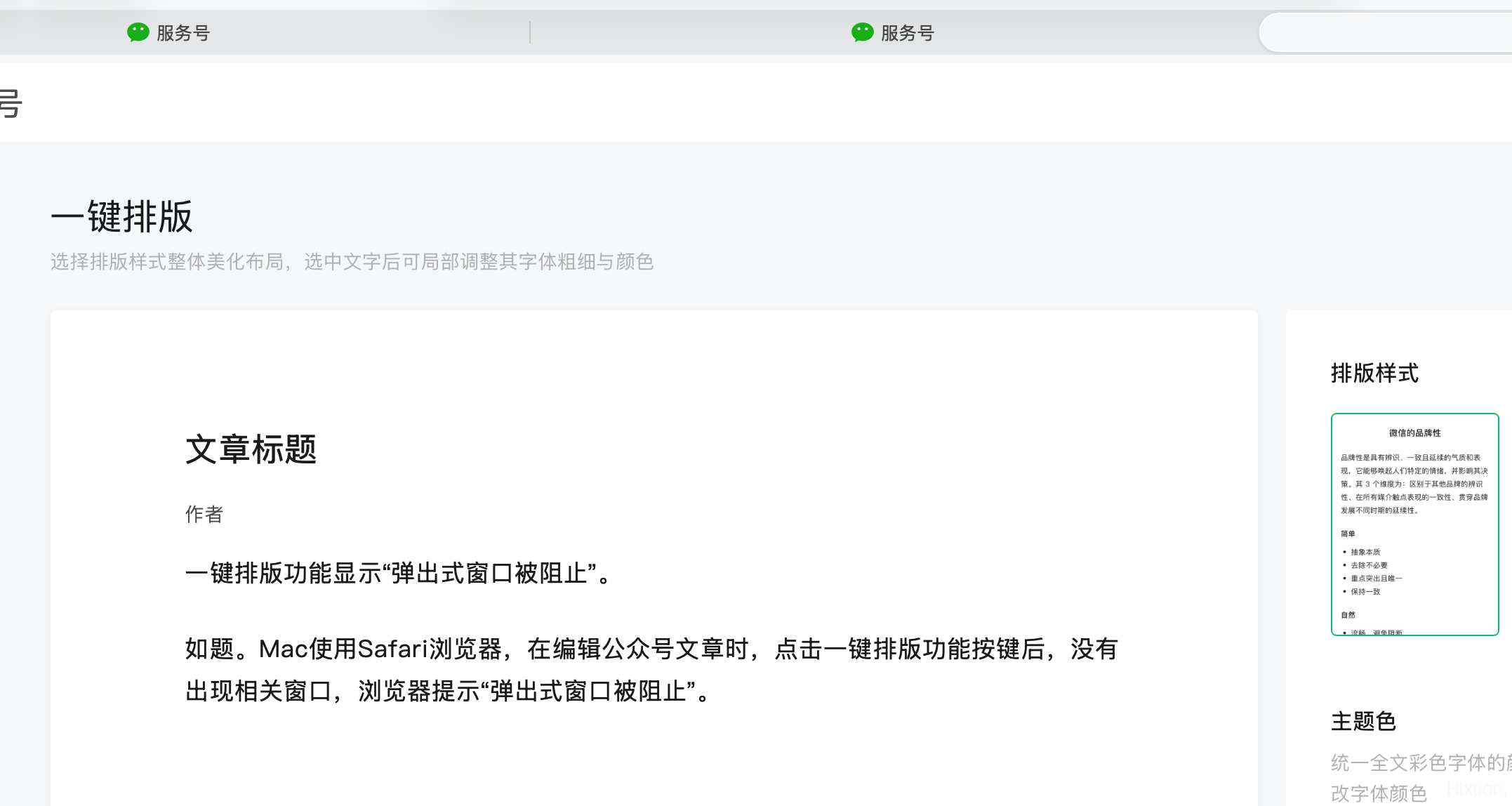 如题。Mac使用Safari浏览器,在编辑公众号文章时,点击一键排版功能按键后,没有出现相关窗口,浏览器提示“弹出式窗口被阻止”。