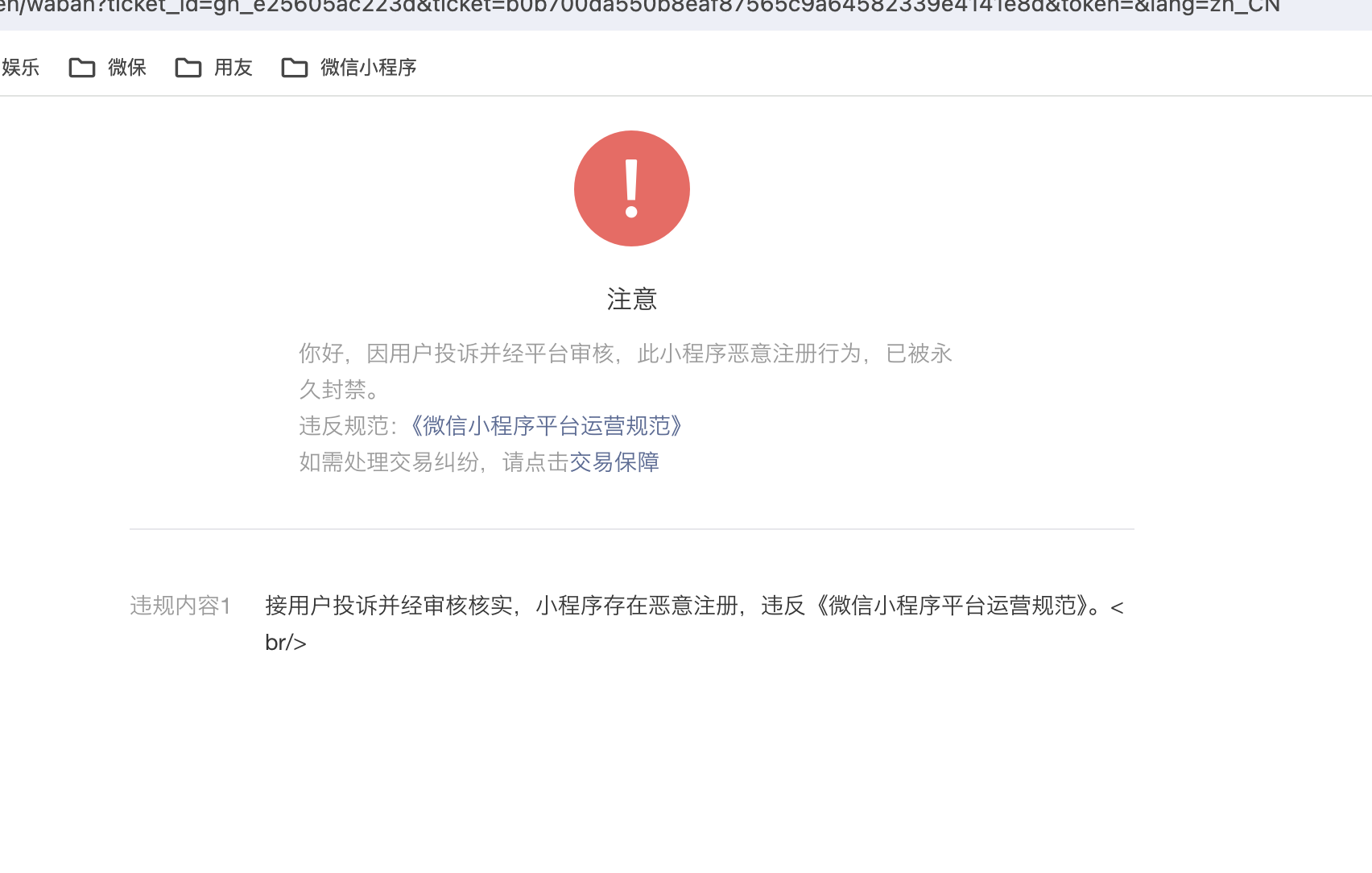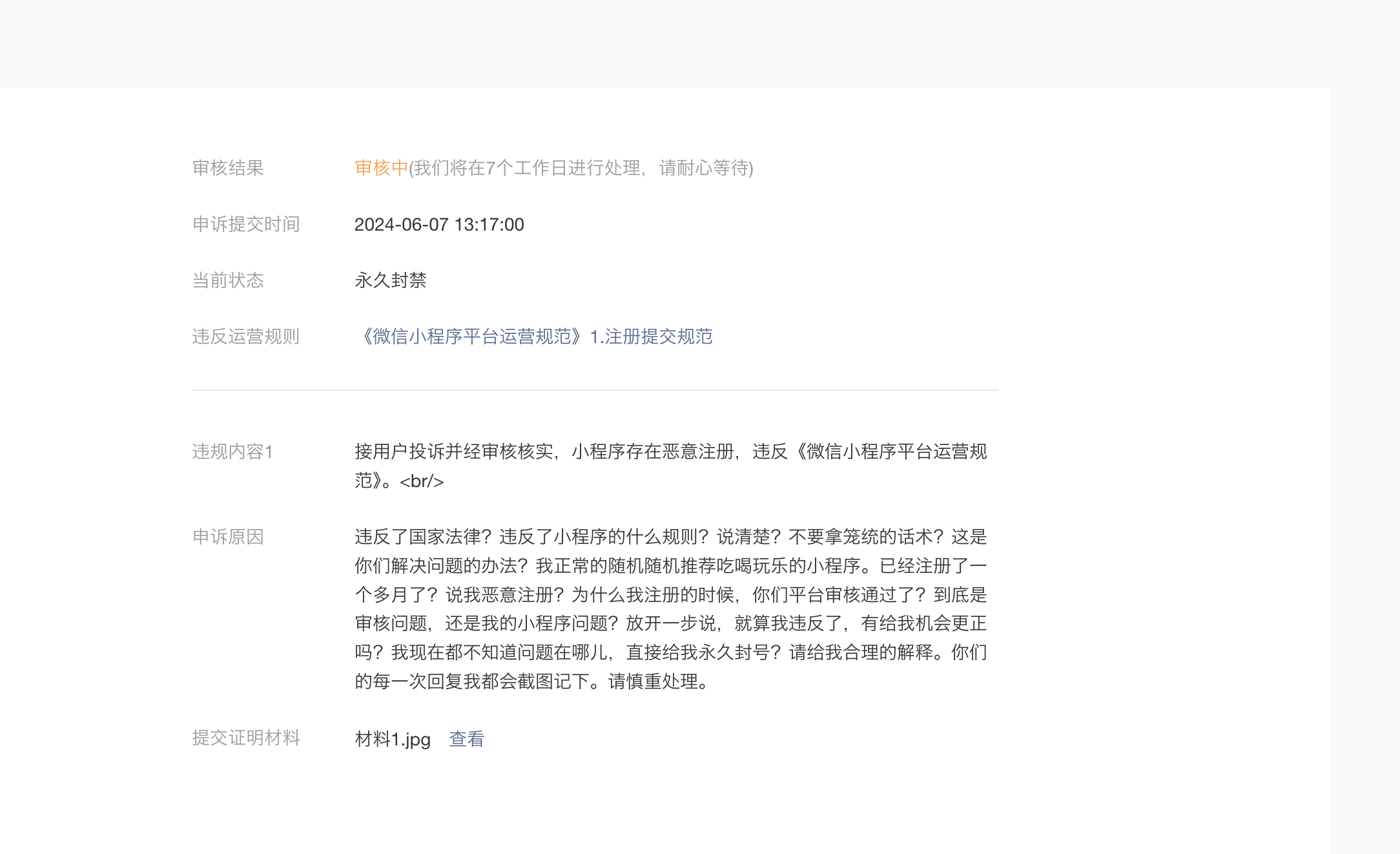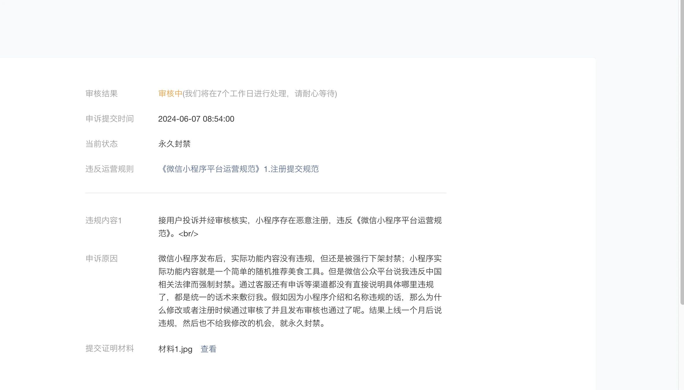 微信小程序发布后,实际功能内容没有违规,但还是被强行下架封禁;小程序实际功能内容就是一个简单的随机推荐美食工具。但是微信公众平台说我违反中国相关法律而强制封禁。通过客服还有申诉等渠道都没有直接说明具体哪里违规了,都是统一的话术来敷衍我。假如因为小程序介绍和名称违规的话,那么为什么修改或者注册时候通过审核了并且发布审核也通过了呢。结果上线一个月后说违规.然后也不给我修改的机会,就永久封禁,只口不提开通小程序开通手续费30元。小程序客服就是推诿工作,撑到7天后无法申诉,目前本人的小程序没有任何渠道可以找回。请官方给予合理的解释和处理。如果小程序官方都是这么办事的,我强烈建议用户们慎重开发小程序。辛辛苦苦的努力,合格合规,最后被莫名封禁。奉劝各位慎重慎重三思而后行。