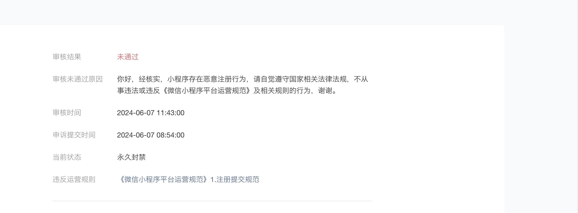 申诉没通过后就无解了,只能下次不做同样的小程序了,个人号本来就很多限制的