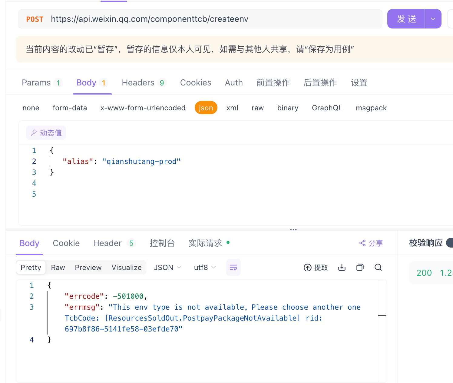 "errmsg": "This env type is not available。Please choose another one TcbCode: [ResourcesSoldOut.PostpayPackageNotAvailable] rid: 697b8f86-5141fe58-03efde70"