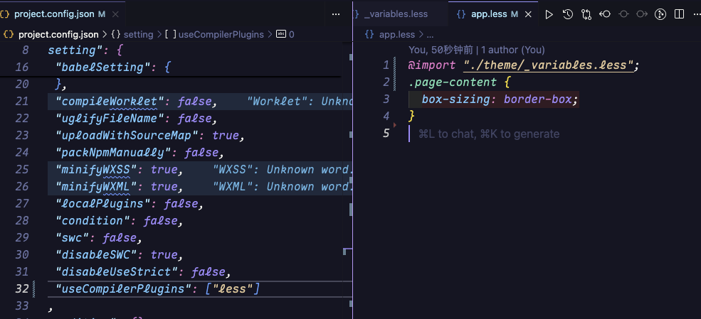 https://developers.weixin.qq.com/miniprogram/dev/devtools/compilets.html基础模板修改为使用less, 配置后app.less 中引入其他less 文件,热更新不生效。 需要手动清空缓存后再编译