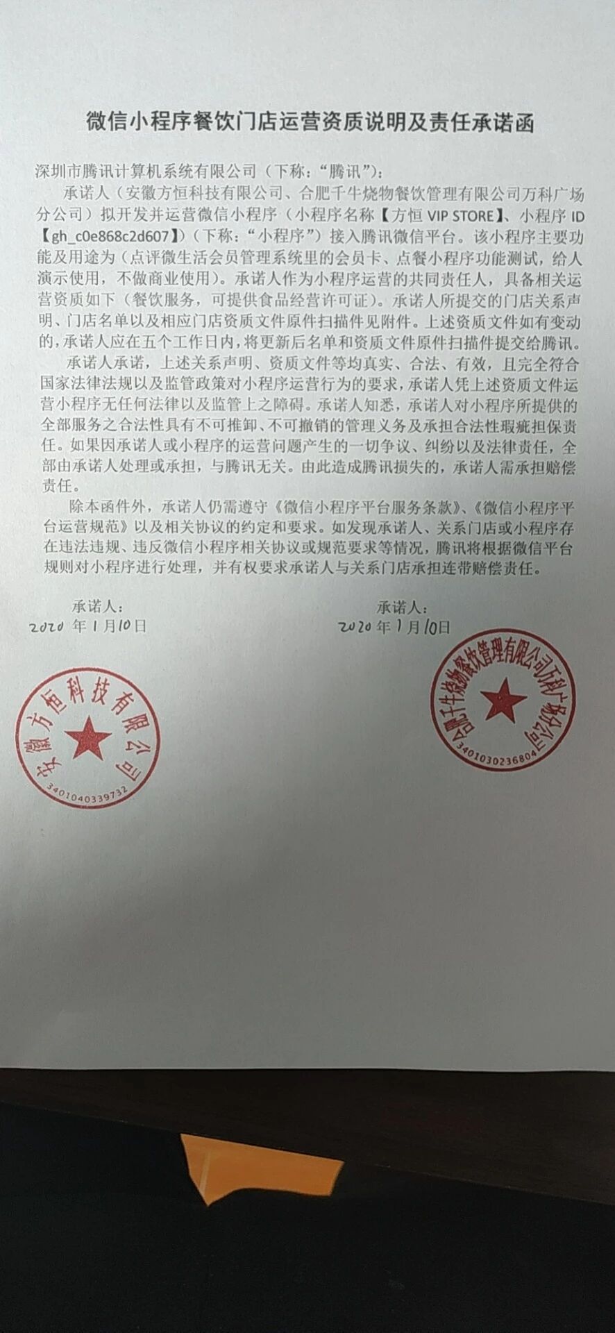 小程序目的是用于第三方会员系统功能测试,服务类目选择餐饮服务,因为我们没有食品经营许可证,所以找了一家合作门店,使用他们的食品经营许可证信息来协助认证;这是他们的食品经营许可证: