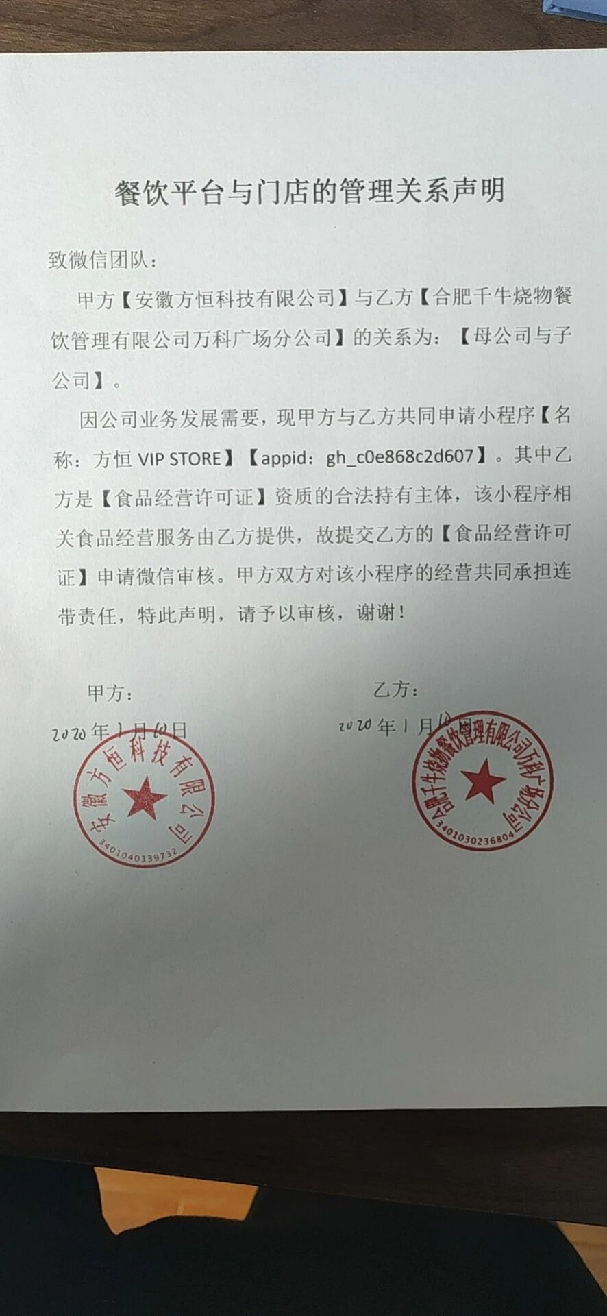 你好,用户提供的关系声明,未在公开渠道核实到相关信息,故提供的关联关系不能支持,建议用小程序注册主体申请餐饮相关资质 或 以资质主体做小程序申请“餐饮-餐饮服务场所/餐饮服务管理企业”类目。