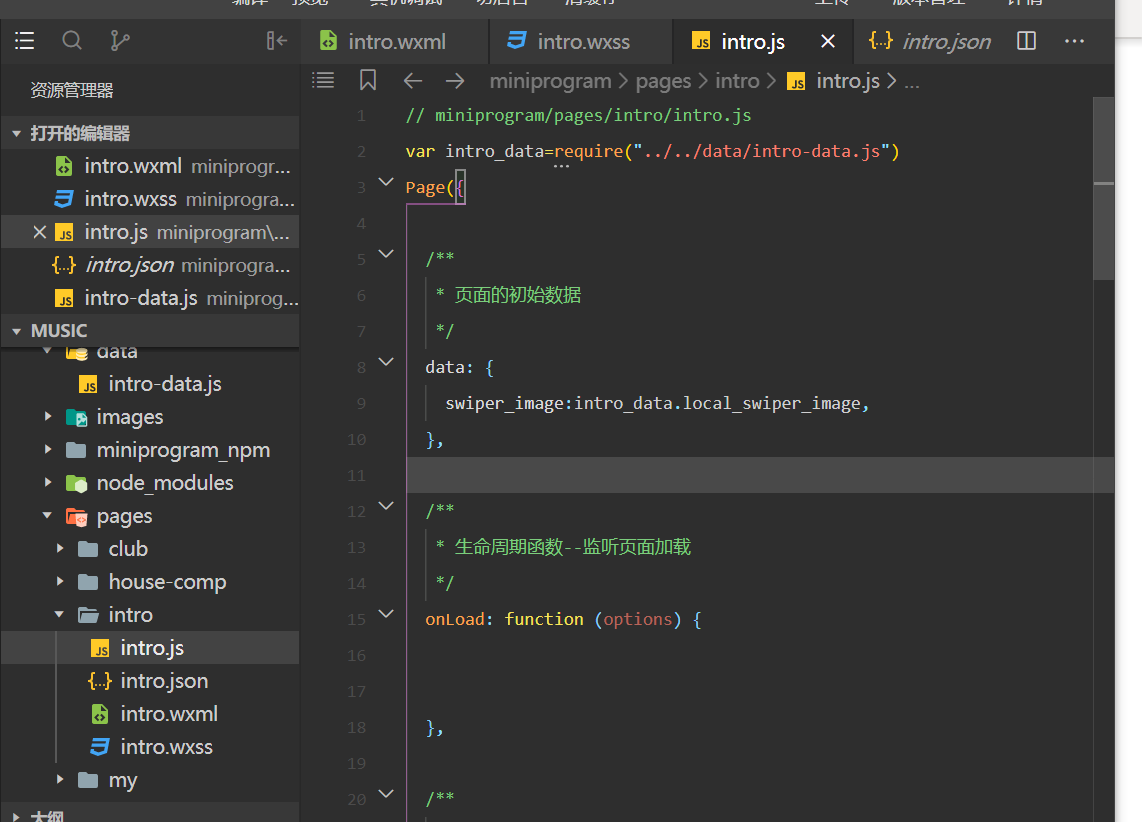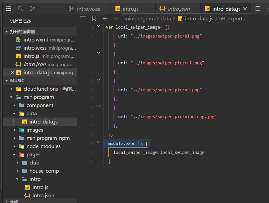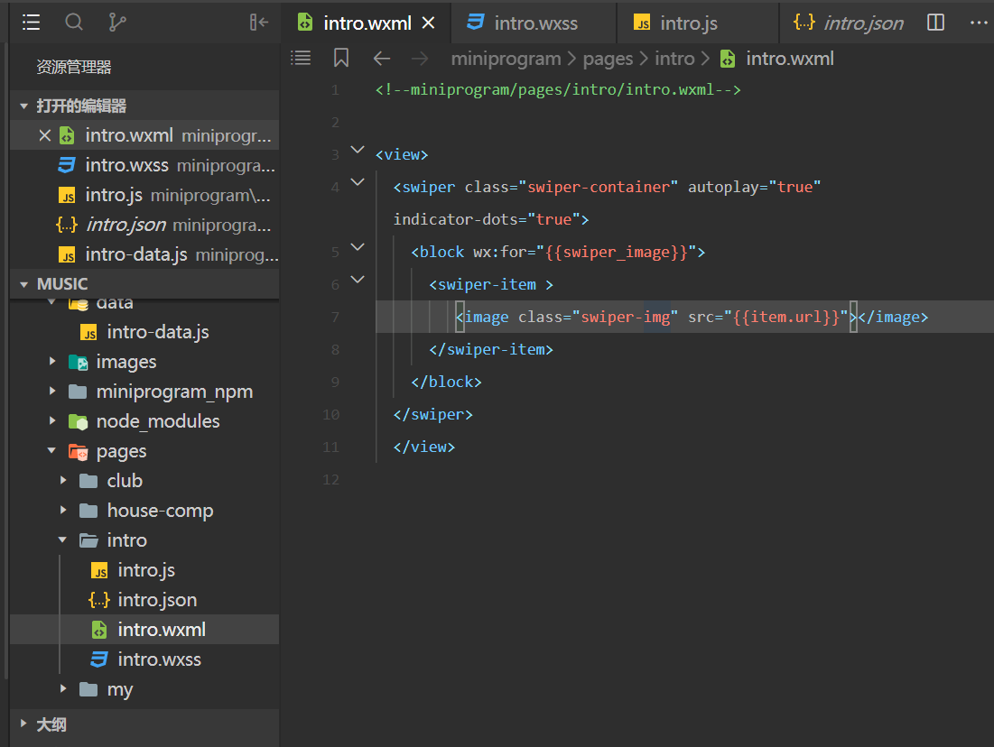 这是intro.wxml页面,想用swiper做一个轮播图,然后循环提取数据
