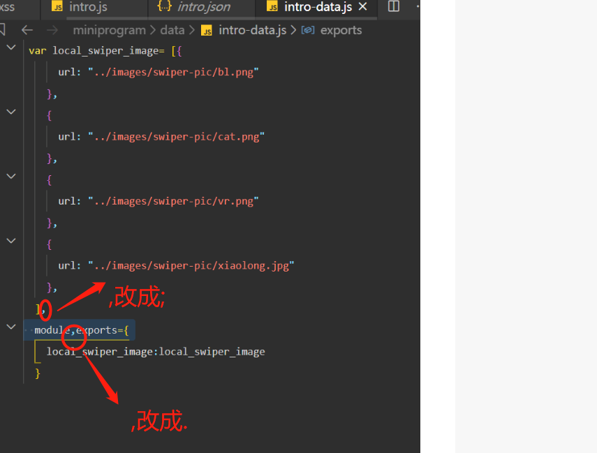 module.exports = {} 中间你写成逗号了,这控制台没报错吗