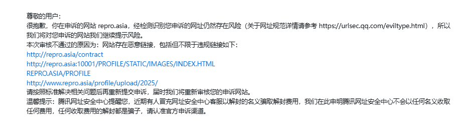 你好,经核实域名repro.asia 被手机管家拦截,本系统只处理被微信暂停提供微信内直接访问的服务的外部链接的申诉问题,若非前述事宜,将不予答复。建议登录手机管家官网【http://gj.qq.com/online_server/complain_url.html】自行申诉,知悉。