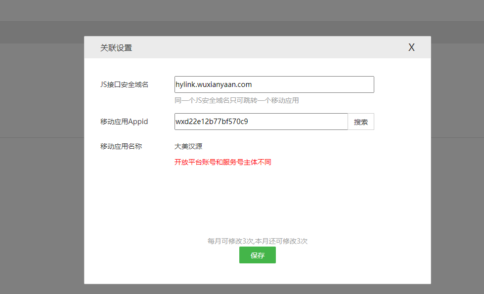 同一主体下的App(AppID:wxd22e12b77bf570c9),服务号(AppID:wx60d55ef9bc8e92e5),在微信开放平台下进行网页跳转移动应用关联设置时,提示账号主体不一致:截图如下: