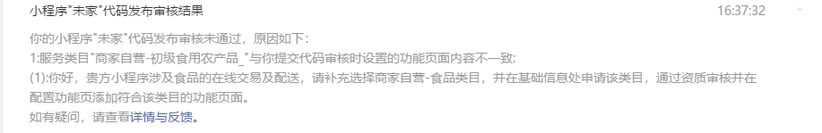 但是审核不通过,提示我们添加食品类目 (这个根本就不给办理食品类目所需要的食品安全证书这些啊)