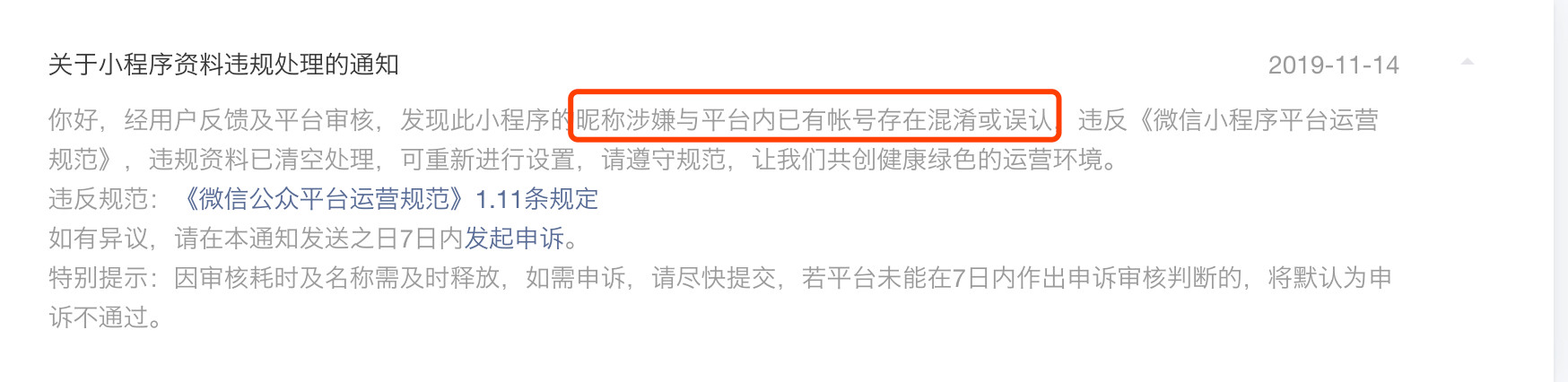 你应该把你的 小程序昵称 贴出来看看,不然怎么知道是不是误判,是不是某种潜规则,光说没有用呀,如果真的不是混淆和误认,贴出来也不怕,大家还能评评理