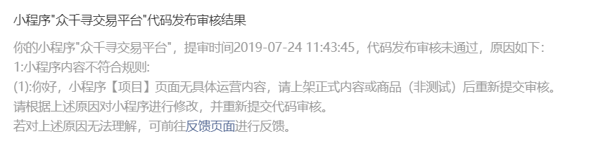 你好,经核实,贵方小程序【项目分类】无具体运营内容,请在小程序服务页面上架正式(非测试)内容或商品后重新提交代码审核。(详图如下)