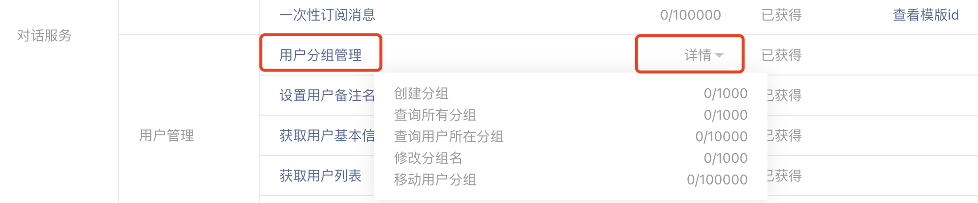 在接口权限可以查看调用量,也可以通过临时调整提高这个量级