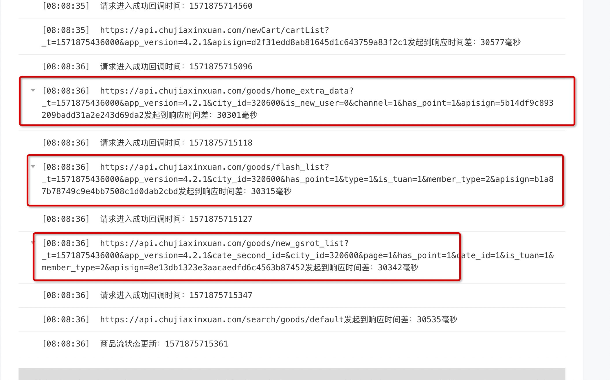 您好,请问一下,最近用户用4G等网络调用接口时一直很卡顿,我们这边用安卓试了一下,也发现了同样的问题,我们写了日志,看反馈卡顿的用户的日志,请求发出到进入success回调用的时间如下图所示,我不知这是什么原因导致的,是偶发性的,玩了一下拼多多的小程序,也同样偶尔有这个问题存在,我们也检查了服务器,我们nginx日志没有相关超时日志,还有我们服务端超过10s就会返回超时500的。麻烦相关人员查看一下wx.request接口是不是有问题。