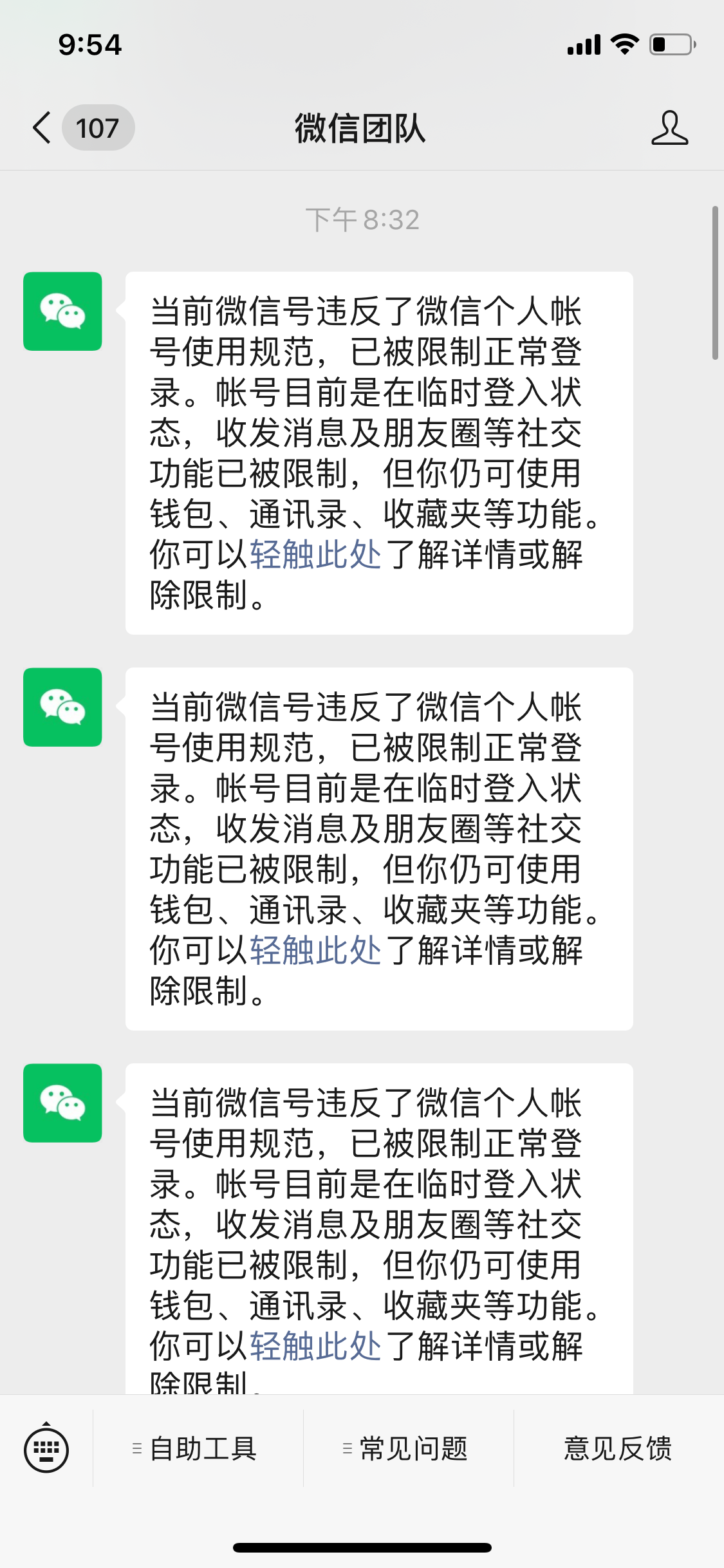 前天被拉进了红包接龙赌博群,玩了一下午,不想玩了退群,结果被群主带人连续恶意举报我,在昨天把我号封了,我解冻了,今天又把我号封了。