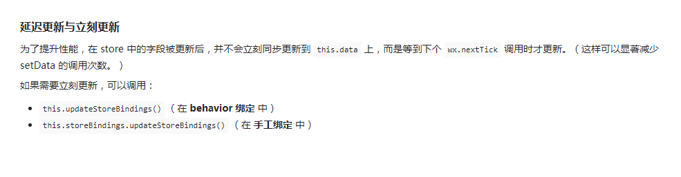 this.storeBindings = createStoreBindings(this, { store, fields: ['numA', 'numB', 'sum'], actions: ['update'], })this.storeBindings.updateStoreBindings() //storeBindings立即推送数据到组件或者页面