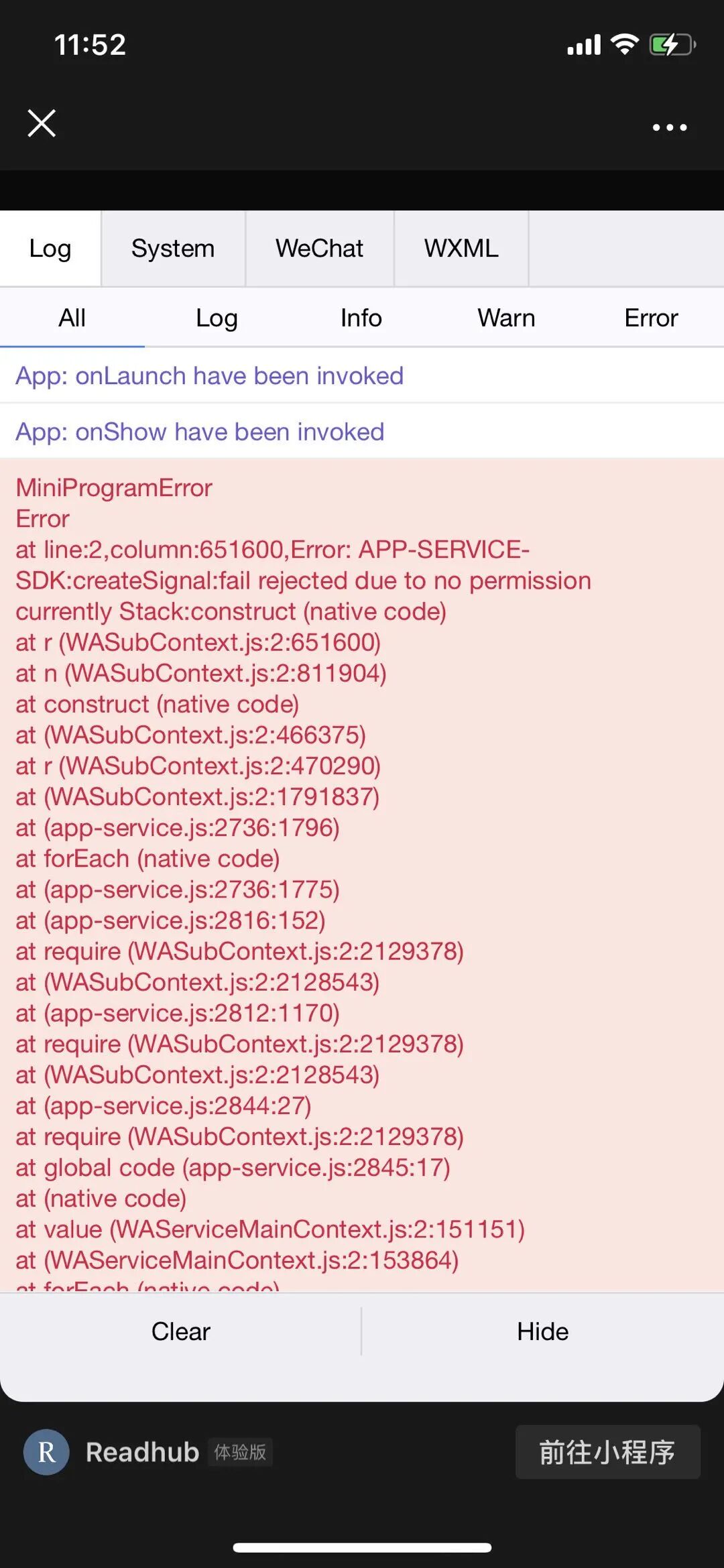 从控制台日志可见报错: APP-SERVICE-SDK:createSignal:fail rejected。