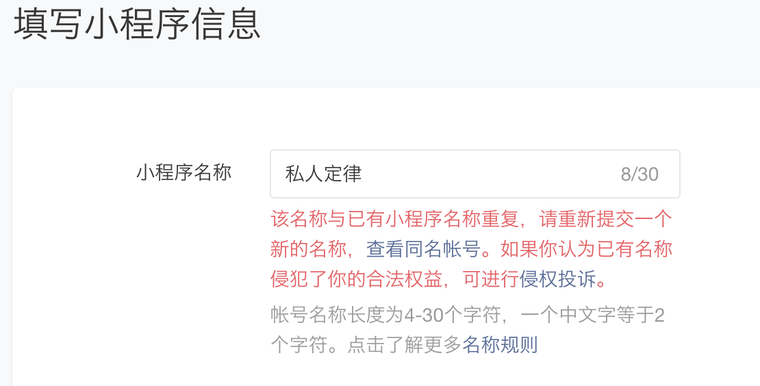 您好,我在填写小程序信息时提示名称已重复,可是我经过搜索并未发现同名小程序;