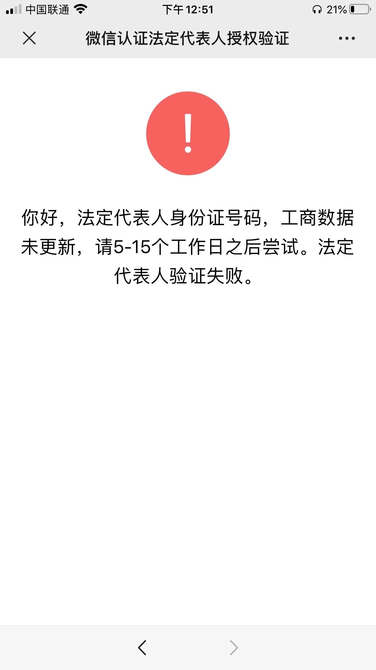我的工商营业执照已经下来几个月了,但是微信认证法定代表人验证总是提示工商数据未更新。原始ID为gh_e5bc11da3329。