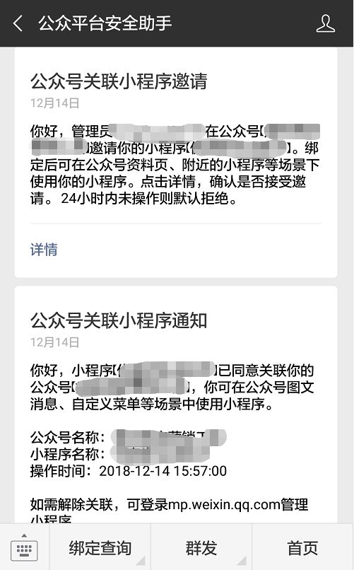 小程序后台是没有关联邀请的,要在小程序管理员的“公众号平台安全助手”的模板消息中操作,具体如下图:![]()