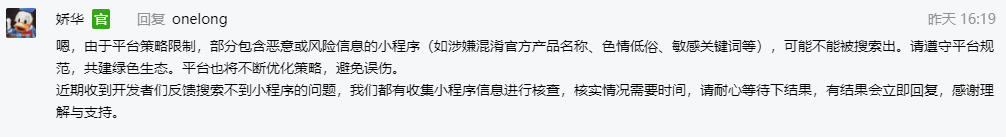 我们的小程序发布上线好几天了,之前可以搜索的,今天突然发现搜索不到,是什么原因,求解
