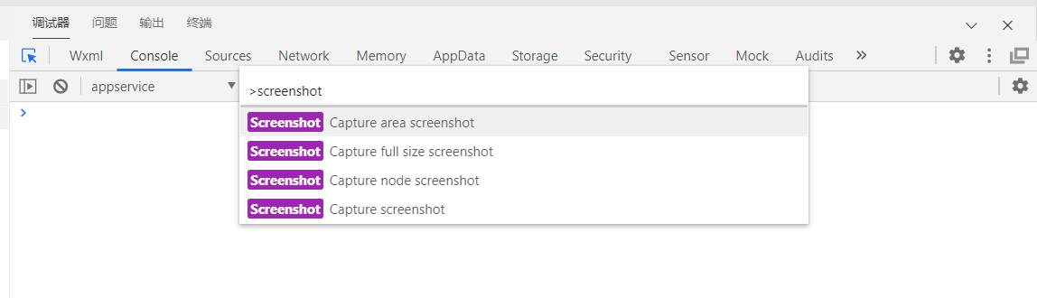 话说,浏览器中可以在Console使用截图指令,但在微信开发者工具的Console里使用好像并不能生效(虽然也能弹出来这几项):