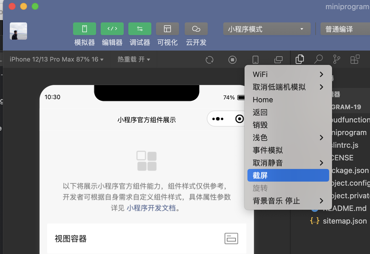 开发者工具的模拟器上能直接截屏吗?有这个功能吗
